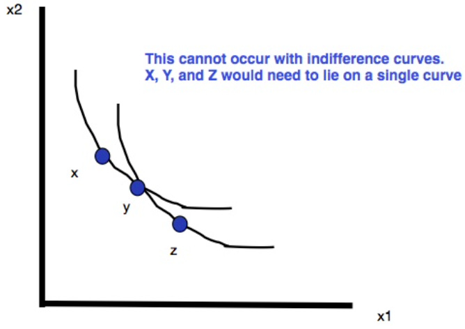The issue we run into with crossing indifference curve like those shown above is a violation of transitivity. Since bundle X and bundle Y lie on the same indifference curve they must be liked as well as each other. But Y and Z are also on the same indifference curve so the consumer must like Y and Z the same. However, there’s a portion from the indifference curve that X lies on that crosses into the weekly preferred set of the indifference curve that Z lies on. So those bundles must be preferred to Z which is a contradiction because they’re as good as Y which is supposed to be as good as Z!