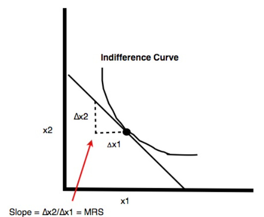 The marginal rate of substitution is the slope of an indifference curve at a particular point. It is a measure of the rate at which the consumer is just willing to substitute one good for the other. What we’re doing is taking a little of good one away, ∆x1, and replacing it with a little of good two, ∆x2, to keep them indifferent. As these amounts become infinitesimal the ratio ∆x2/∆x1 approaches the slope of indifference curve