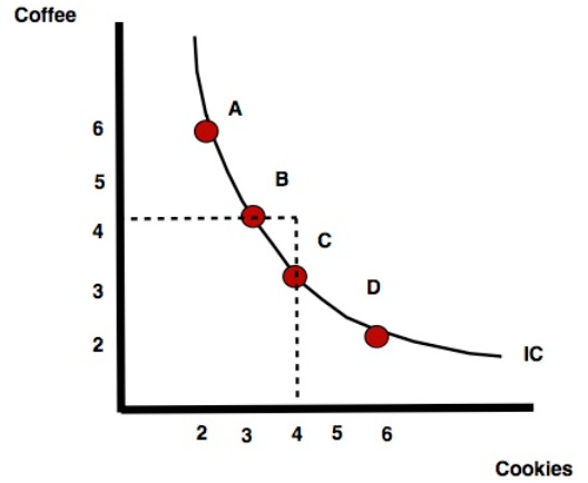 B to C:[(3,4)to(4,3)]: Giving up 1 coffee and I can be as happy replacing it with 1 cookie therefore MRS = 1