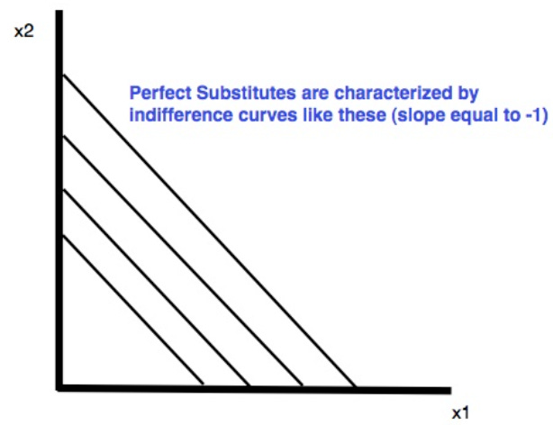 Two goods are perfect substitutes if the consumer will substitute one good for the other at a constant rate. An example is one for one substitution. The key characteristic is indifference curves with a constant slope, i.e. straight line